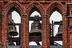 The five church bells are located on the cathedral's roof behind a tripartite screen of lancet arches on the left side of the façade. They were poured by the Felczyński bell foundry in Przemyśl, Poland and donated by bishop Wiktor Skworc[4][12] The bells are electronically activated. The largest weighs 900 kilograms (2,000 lb) and bears the name "Our Lady of Fátima". The other bells are named, from the smallest to the largest: "John Paul II"; "St. Jude", named after the patron saint of archbishop Tadeusz Kondrusiewicz; "Anniversary-2000"; and "St. Victor", named after the patron saint of Bishop Wiktor Skworc.[4][12]