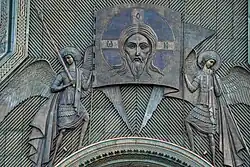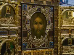 The decor of the church, the icon, the iconostasis (icon wall), and the marching military icons are made of copper with enamels. The image of the Saviour-Not-Made-by-Hands in the central dome of the church is the largest image of Christ's face executed in mosaic.