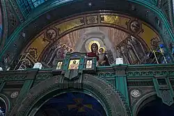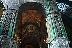 The church, and the imagery within it, have been linked to the 'Russkiy mir' or 'Russian world' theology which some Orthodox Christian Churches outside Russia have described as a heresy.[16] This ideology has been described in the Financial Times as "Putin’s creation of an ideology that fuses respect for Russia’s Tsarist, Orthodox past with reverence for the Soviet defeat of fascism in the Second World War. This is epitomised in the Main Cathedral of the Russian Armed Forces, 40 miles west of Moscow, opened in 2020."[17] During the Russian invasion of Ukraine, the church has come to be seen as a symbol of Russian militarism, with Russian operations in Ukraine being described as "holy" by Russian authorities.[18]