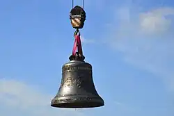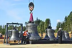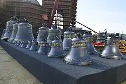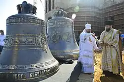 The bells were made at the Voronezh Foundry. The decoration of the bells repeats ornaments decorating the cathedral. The bells reflect the theme of Victory in the Great Patriotic War, icons of patrons of the Russian Army. The main bell-evangelist was decorated with bas-reliefs depicting key events of the Great Patriotic War. Work on the manufacture of the bells was carried out for six months. The ensemble weighs more than 20 tonnes, which includes 18 bells, the largest of which weighs 10 tonnes.[9] 17 of the 18 bells are dedicated to the types and arms of the troops. On one side a military emblem is applied to the bell, on the other, the image of the patron saint.[9] In August 2019, the bells were installed in the belfry of the cathedral.