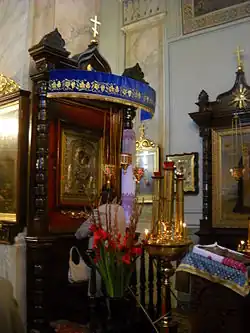 The icons of the Mother of God kept in the church are particularly venerated: a copy of the Jerusalem Icon of the Mother of God[14] and a copy of the Lublin Icon of the Mother of God.[4] During the period of Russian Partition, the church also received a stone from Golgotha as a gift from Patriarch Damian of Jerusalem.[14] The church also houses a copy of the Theotokos of Pochayiv, originating, like the iconostasis, from the older church that previously stood on the cathedral site.[6] In November 2015, an icon of Andrew the Apostle (painted in the Pochaiv Lavra) was brought to the cathedral; the icon contains a relic of the saint (sent from Greece).[35] The cathedral also housed relics of St. Seraphim the Confessor, which were transferred to the church in Rzeszów in December 2017.[36]