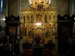 In 1881, a comprehensive renovation of the building was carried out (funded by Tsar Alexander II),[6] removing the last elements foreign to the tradition of the Russian Orthodox Church. During the renovation, the design was somewhat carelessly based on patterns from Konstantin Thon's Projects of Churches.[13] In subsequent decades (until the Russians withdrew from Lublin), the church received gifts from Patriarch Damian I of Jerusalem and Metropolitan Philotheus of Kyiv.[14] The first of these hierarchs presented the Church of the Transfiguration with a copy of the Jerusalem Icon of the Mother of God, along with a fragment of the True Cross placed at the Church of the Holy Sepulchre.[6]