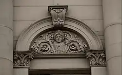 The carving in the most prestigious position, in the tympanum over the main entrance, is the sole contribution by Thomas of London, the "sculptor of the Houses of Parliament." The artisan credited for the general carving work on the building is "Mrs Mawer, Leeds", who lived next door. She was responsible for the huge Corinthian capitals and the ornamental turrets on the roof.[50] However Robert Mawer was working on the "large keystones carved with Mythical heads" or "giant masks",[48] between 1853 and 1854, when he died.[51] Thomas Whiteley, the stonemason associated with Robert Mawer, also worked on the building; he was not a sculptor.[52] The carvings are in Rawdon Hill millstone grit.[48]