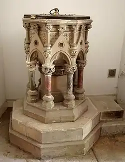 "The pulpit, which is of elaborate design, stands on a pedestal of Caen stone, and is of hexagon shape. It stands on the north of the chancel arch ... The font, on the left hand as you enter the church by the south side porch, is a very beautiful work of art; it is of octagon shape, and [its stand is] covered with encaustic tiles on the top and sides. The font itself is made of Caen stone, and very elaborately carved with the emblems of the Four Evangelists in bold relief, and an inscription running round the top part in old character. The inscription is, "Except a man be born of water and of the Spirit he cannot enter the kingdom of God."[58] The font is, we understand, the gift of the vicar. The carving has been done at Leeds, by Messrs. Mawer, from sketches by the architect."[57] (Hull Packet, 3 June 1859)