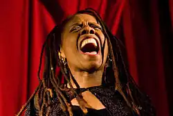 Her voice has been described as "reminiscent of many of the great jazz and blues singers. Her phrasing is impeccable and her delivery relaxed and effortless; it never seems as if she's 'trying.'"[2] The New York Times stated that her performances project "a strength, good humor and intelligence that engulf the room in a mood of bonhomie."[5] Her rendition of Irving Berlin's tune "Harlem on My Mind" was highly praised by the Jazz Times which declared that, "if there's a post-millennial answer to Dinah Washington, surely it's Catherine Russell: same remarkable vocal dexterity-blues shouter meets jazz stylist; same espresso-strength power; same immaculate clarity; same ability to shift seamlessly from sassy to torchy."[7]