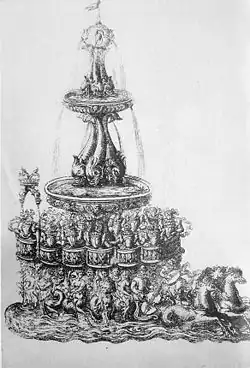 A spectacular fête was held during the reign of Catherine's son Henry III to celebrate the marriage of his sister-in-law, Marguerite of Lorraine, to his favourite, Anne, Duke of Joyeuse, on 24 September 1581. Entertainments were laid on almost every day for two weeks after the wedding, in what art historian Roy Strong has called "the climax of Valois festival art".[28] The chief artist employed to design the magnificences was Antoine Caron, who was aided by the sculptor Germain Pilon. Among the writers were Dorat, Ronsard, and Philippe Desportes; and the music was written by Claude Le Jeune and the Sieur de Beaulieu, among others.