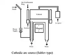 A Sablev type Cathodic arc source, which is the most widely used in the West, consists of a short cylindrically shaped, electrically conductive target at the cathode with one open end. This target has an electrically-floating metal ring surrounding it, working as an arc confinement ring (Strel'nitskij shield). The anode for the system can be either the vacuum chamber wall or a discrete anode. Arc spots are generated by a mechanical trigger (or igniter) striking on the open end of the target making a temporary short circuit between the cathode and anode. After the arc spots are generated they can be steered by a magnetic field, or move randomly in absence of magnetic field.