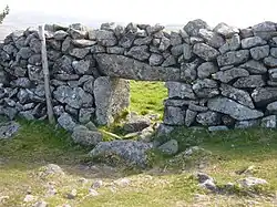 On Dartmoor, in south-west England, the term sheep creep is used to describe a purposely constructed gap in the base of a drystone wall, commonly topped with a granite lintel. The gap allows sheep to pass from field to field, but is deliberately too small for cattle or ponies.[1] Similarly in Cornwall small gaps are constructed in Cornish hedges to allow sheep to pass through to graze the cliff-tops. In order to prevent sheep passing through the gap is covered using a large slab of slate.