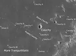 To the north of Cauchy is the rille named Rima Cauchy, a 210-kilometer-long graben.