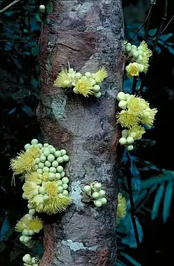 Cauliflory is a botanical term referring to plants that flower and fruit from their main stems or woody trunks, rather than from new growth and shoots.[1] It is rare in temperate regions but common in tropical forests.[2]