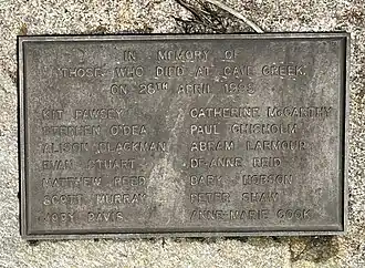 ![]() Memorial at the start of the Cave Creek Kotihotiho Memorial Track, renamed in 2020 on the 25th anniversary of the disaster | |