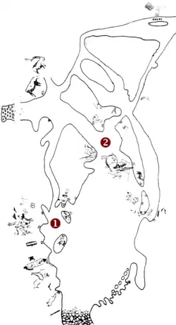 Entering through Gallery A, after 60 or 70 meters, through a tunnel on the right, the first big room of Gallery B is met with. Fairly far away from the entrance which is used nowadays there are various old exits to the exterior which have become blocked with the passage of time. One of them has been made into an opening, but it is not known whether, in the epoch in which this area was decorated, any of these were usable, which would be a help in understanding the point of view which the prehistoric artists would have taken in conceptualizing the zonal arrangement and levels of the room's decoration.[note 5]