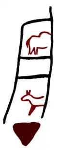 - Claviform signs: The signs called 'claviform' (key-shaped) are fairly abundant, specially in gallery B and in Room XI, but are doubtful if not indeed non-existent in Gallery A. Those of Room XI are the most characteristic and may be associated with horses. One of these can be considered as what Leroi-Gourhan calls a 'coupled sign',[16] made by uniting in the same idiomorph a line or bar (masculine) with a key-shape (feminine). The typology and chronology of these signs is very ample.