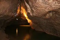 The cave contains abundant speleothems, including stalactites, stalagmites, and flowstone. One feature is said to resemble the Virgin Mary. The operators of the show cave claim that it contains the world's longest navigable underground river, the Rubicon.[2] This river is around 700 meters long and created the cave as it flowed.[2] Within the river, there are shrimp from the genus Niphargus, along with other crustaceans.[3]
