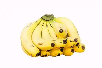 Cavendish cultivars are distinguished by the height of the plant and features of the fruits,[7][13] and different cultivars may be recognized as distinct by different authorities. The most important clones for fruit production include: 'Dwarf Cavendish', 'Grande Nain', 'Lacatan' (bungulan), 'Poyo', 'Valéry', and 'Williams' under one system of cultivar classification.[7] Another classification includes: 'Double', 'Dwarf Cavendish', 'Extra Dwarf Cavendish', 'Grande Naine', 'Pisang Masak Hijau' (syn 'Lacatan'), and 'Giant Cavendish' as a group of several difficult to distinguish cultivars (including 'Poyo', 'Robusta', 'Valéry', & 'Williams').[13] 'Grande Naine' is the most important clone in international trade, while 'Dwarf Cavendish' is the most widely grown clone.[13] 'Grande Naine' is also known as Chiquita banana.[14]