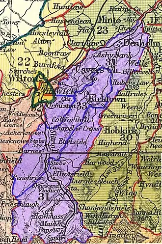 The parish of Kirkton was bounded by the parishes of Hawick and Teviothead in the west and by Cavers on all the other sides. It had a length of 8½ miles, from north-east to south-west, and its width (east-west) varied from half a mile to almost two miles. The Kirk of Kirkton was in the north–east and Stobs station (Waverley line) was in the south–west of the parish. Area 6,222 acres.[15]