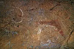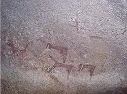 Dhambalin ("half, vertically cut mountain") is an archaeological site in the northwestern Sahil province of Somaliland. The sandstone rock shelter, contains rock art depicting various animals, such as horned cattle and goats, as well as giraffes, an animal no longer found in Somaliland region.[2] The site also features the earliest known pictures of sheep in Somaliland. Discovered in autumn 2007, residents of Beenyo Dhaadheer reported the rock art to the Somali archaeologist Sada Mire, Director of the Department of Archaeology within the Ministry of Tourism and Culture of Somaliland.[3]