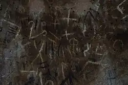 Dhaymoole is an archaeological site in the Sahil province of Somaliland.[4] The walls of the cave are full of infilled and outlined white camels, unidentified quadrupeds and symbols. Most of the quadrupeds are schematic and depicted upright facing right. Dhaymoole, Somaliland.[5] Caves of Dhaymoole, believed to be about 3000 to 5000 years old.