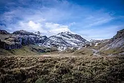 Cayambe, which has a permanent snow cap, is a Holocene compound volcano which last erupted in March 1786.[1] At 4,690 metres (15,387 ft), its south slope is the highest point in the world crossed by the Equator, and the only point on the Equator with snow cover. The ice cap covers an area of about 22 km2 (8 sq mi) and there are glaciers on the eastern flank descending to about 4,400 m (14,400 ft), whereas those on the drier western flank reach about 4,700 m (15,400 ft).[2] The volcano and most of its slopes are within the Cayambe Coca Ecological Reserve.[3]