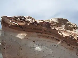 Away from the type area, material now being called "caymanite" is not an "uncommon variety of dolostone" as it is sensu stricto at the type area. It has been reported from the Buda Hills of Hungary.[2] Caymanite occurs as a fine grained or vug filling variety of the mineral dolomite CaMg(CO3)2. It occurs as white to red and black filling in fossil molds, small cavities and caves.[3] It is used as a semi-precious stone. In New South Wales, Australia, pockets of later-deposited beds (usually reddish) are widespread in the Silurian-Devonian limestones. These are thus far reported only from the Lachlan Fold Belt portion of the Tasman Orogenic Zone. They are mostly small pockets but occasionally reach up to several metres wide. These had been long known about and began to be referred to as Caymanite by Dr. Armstrong Osborne who also worked up and published the finding that the Jenolan cave complex is world's oldest known and dated open cave system. The best description so far of the New South Wales caymanite is from Jenolan Caves. None of the NSW material is silicified or in any way suitable for use as a semi-precious stone.