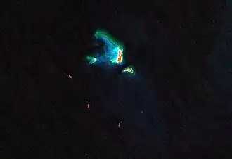 The Cayos Arcas is a chain of three tiny sand cays and an accompanying reef system in the Gulf of Mexico, 128 kilometres (80 miles) from the mainland.[11] It is located approximately 130 kilometres (81 miles) from the mainland, west of Campeche. Their aggregate land area is 22.8 hectares (56.3 acres). They belong to the municipality of Campeche in the state of Campeche.
