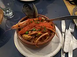 Cazuela de mariscos is a popular seafood stew from the Caribbean region of Colombia (especially Cartagena, Barranquilla and Santa Marta).[1][2] Its preparation, as well as its ingredients, tend to vary slightly in different regions.[1][3] It may have been influenced by the Catalonia region in Spain.[4]