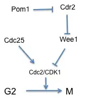Pom1 is a serine/threonine protein kinase that localizes to the cell tips. It is a partial mechanism for the formation of the medial distribution of Cdr2 in the cell; Pom1 has been demonstrated to prevent Cdr2 from diffusing into the non-growing end of the cell in interphase.[3] As seen in figure 1, Pom1 directly inhibits Cdr2. This is done through phosphorylation of Cdr2 on a residue between 423 and 532 on the non-catalytic C-terminus. Once phosphorylated, Cdr2 is unable to inhibit the kinase Wee1, which is then able to maintain CDK1 in a hyper-phosphorylated state incapable of progression into mitosis. Mutation and deletion of Cdr2 result in a delay into mitotic entry, leading to larger cells. However, the cells still enter mitosis, presumably because Cdr2 is the link in only one pathway that couples cell length to mitotic entry. Thus, Cdr2 is non-essential to the decision to enter mitosis.