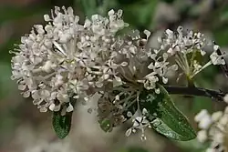 The flowers are about 2 mm across[4] and white, borne in thick clusters emanating from the leaf axils,[2] particularly on the older stems.[4] They all open at once, so the plant is covered with bloom. This usually happens in June or July, but may be any time from April to October according to the altitude and weather. As in other ceanothuses, there are five spoon-shaped or hooded petals, each partly covering a stamen.[2]