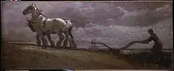 At the outbreak of the First World War Aldin was the sole Master of the South Berkshire Foxhounds and became a Remount Purchasing Officer in charge of an Army Remount Depot. A number of other artists, including Lionel Edwards, Alfred Munnings G.D. Armour and Cedric Morris, also worked in Remount Depots during the War. Such was the military demand for horses Aldins' own mounts were among the first to be given up to the Army. Aldin set up a number of Remount Depots around Berkshire including, as an experiment, one run entirely by women as there were no longer enough men available for the work. The experiment was deemed successful and a number of Ladies' Army Remount Depots were established. This brought Aldin to the attention of the Women's Work Sub-Committee of the newly formed Imperial War Museum who, in February 1919, asked to purchase two of his wartime paintings. Women Employed in the Remount Depot, The Kennels, Pangbourne was duly purchased but Aldin was unwilling to release the second picture requested. The original of A Land Girl Ploughing, a realistic portrayal of a lone Land Girl guiding two large horses, had been done on old, re-used canvas using leftover scene paint and, in Aldin's view, was not suitable for a national collection. He agreed to replicate the painting with better quality materials and a member of the Women's Land Army was sent to his studio in Pangbourne to model as the plough girl, and ensure all the details of the uniform were correct. The painting is considered among the most iconic images of the work of the Women's Land Army from World War One.[2] Aldin lost his son, Dudley at Vimy Ridge in 1917, which affected him deeply for many years and had a profound effect on his style of work.