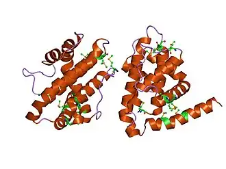 Apoptosis in C. elegans is often simplified to interactions between four major proteins in the pathway; EGL-1, CED-9, CED-4, and CED-3. CED-3 is the final protease in the interaction network and is responsible for activating the proteins involved in cell disassembly.[13] CED-9 is said to protect cells from the apoptosis pathway.[7] Under normal conditions, in a cell not experiencing apoptotic signalling, CED-9 forms a complex with CED-4 at the membrane of the mitochondria.[14] This interaction sequesters the pro-apoptotic signalling of CED-4. CED-4 consists of an asymmetric dimer of CED-4a and CED-4b proteins in which CED-9 can specifically recognize and bind CED-4a.[14] This interaction is a highly specific recognition and binding interaction between the N-terminal tails of both proteins.[14] When the cell receives an apoptotic signal via a receptor commonly referred to as a "death receptor", the protein EGL-1 is activated.[5] The active EGL-1 binds CED-9 causing a Conformational change that interrupts and inhibits the CED-9 - CED-4 interaction.[14] CED-4 is free to dissociate and activate the CED-3 protease effectively triggering the final stages for apoptosis.[5]