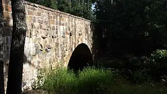 The Davies Bridge carries Red Bluff Drive across Cedar Creek, just north of Arkansas Highway 154 in Petit Jean State Park, Arkansas. It is a single-span closed-spandrel masonry arch structure, with an arch 20 feet (6.1 m) long and 10 feet (3.0 m) high. It is built out of mortared ashlar fieldstone laid in courses, with some stones left rusticated and protruding from the sides. The bridge was built in 1934 by a crew of the Civilian Conservation Corps that was developing the park's facilities.[2]