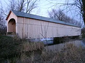 Built in 1864-65, the bridge was one of Vermont's few covered bridges which spanned town lines, and was the only surviving 19th-century covered bridge in both Cornwall and Salisbury.[2] Refurbished in 2007-2008, the bridge was severely damaged by fire on September 10, 2016.[3][4]