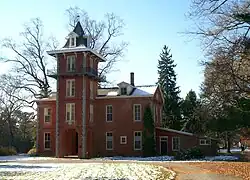 Taylor built the mansion he named Cedarcroft near Kennett Square, Pennsylvania in 1859–1860. He personally supervised its construction, including its two-foot walls and tall tower, and later wrote a series of articles about it. He also owned the surrounding 200 acres of land which he had spent several years acquiring.[3] He described the building's design as "large and stately, simple in its forms, without much ornament... expressive of strength and ornament."[3] He lived here with his wife Marie Hansen, the daughter of the Danish/German astronomer Peter Andreas Hansen, whom he married in 1857.[4] Several of Taylor's writings were either written at Cedarcroft or reference it, including his 1863 book The Poet's Journal, which he dedicated to his wife as "the Mistress of Cedarcroft".[5]