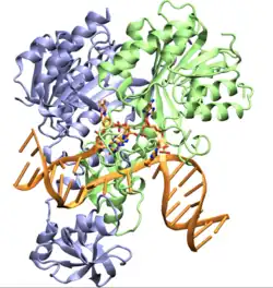 CcrM (or M.CcrMI) is an orphan DNA methyltransferase, that is involved in controlling gene expression in most Alphaproteobacteria. This enzyme modifies DNA by catalyzing the transference of a methyl group from the S-adenosyl-L methionine substrate to the N6 position of an adenine base in the sequence 5'-GANTC-3' with high specificity.[1] In some lineages such as SAR11, the homologous enzymes possess 5'-GAWTC-3' specificity.[2] In Caulobacter crescentus CcrM is produced at the end of the replication cycle when Ccrm recognition sites are hemimethylated, rapidly methylating the DNA. CcrM is essential in other Alphaproteobacteria but its role is not yet determined. CcrM is a highly specific methyltransferase with a novel DNA recognition mechanism.[3]