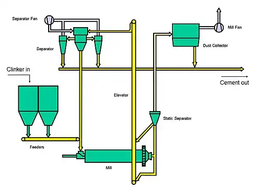 - ^ Spanish: molino de cemento, French: broyeur de ciment, German: Zementmühle: other languages correspond with the British usage