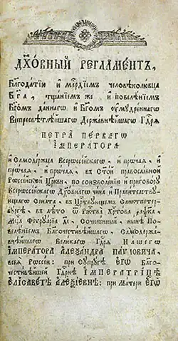 - ^ "Духовный регламент". Brockhaus and Efron Encyclopedic Dictionary: In 86 Volumes (82 Volumes and 4 Additional Volumes) (in Russian). St. Petersburg: F. A. Brockhaus. 1890–1907.