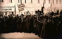 During the Revolution a number of pictures were taken of successful fighters celebrating their victories. These were often used as postcards after the war. The background of the original image includes a store that says in Russian, "Watches, gold and silver". The image was then changed to read, "Struggle for your rights", and a flag was changed to more clearly read, "Down with the monarchy – long live the Republic!".[4]