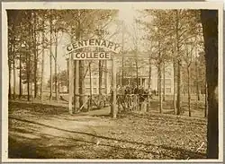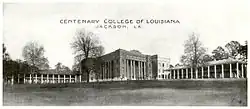 In 1846, the college's trustees changed the institution's name to Centenary College of Louisiana and adopted the alumni of the two predecessor colleges.[7] During the 1850s, enrollment reached 260, and the college constructed a large central building, which included classrooms, laboratories, literary society rooms, a library, a chapel, offices, and an auditorium with seating for over 2,000 people.[8] This prosperity halted with the American Civil War. Following a meeting on October 7, 1861, the faculty minute book states, "Students have all gone to war. College suspended; and God help the right![9]" During the war, both Confederate and Union troops occupied the campus’ buildings.[10] Centenary reopened in the fall of 1865, though it struggled financially through the remainder of the nineteenth century. In 1906 the Louisiana Conference of the Methodist Episcopal Church, South, accepted an offer from the Shreveport Progressive League to relocate the college.[11] The Jackson campus now serves as the Centenary State Historic Site operated by the Louisiana Office of State Parks; it is listed on the National Register of Historic Places.[10]