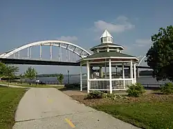 Centennial Park is one of four parks located along the Mississippi River in downtown Davenport, Iowa, United States. The other three are LeClaire Park, which is immediately to the east of Centennial Park, Veterans Memorial Park, which is being developed immediately to the west,[1] and River Heritage Park that is under development on the far east side of downtown. Development of the 250-acre (1.0 km2) park was begun in 2000.[2] Its name is derived from the Rock Island Centennial Bridge, which is on the east side of the park. Centennial Park features a boat ramp, a playground, a gazebo, fishing areas, a dog off leash area, basketball courts, a sprayground, and a skateboard park. The skate board park is used for skateboarding, roller blades and BMX bikes. The Riverfront Parkway passes through the park, and the River's Edge, an indoor sports complex operated by Davenport Parks and Recreation, is on the northeast corner of the park.