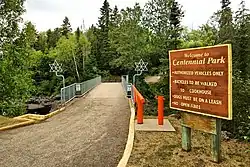 Developed in 1967, Centennial Park is a large park area that follows the shores of the rocky Current River in the north end of Thunder Bay, Ontario. The park was built to represent the history of logging in Port Arthur (Now part of Thunder Bay). The park features many replicas of the equipment and living conditions on logging camps in the early 20th century. The park also features recreational facilities, such as recreation trails, an animal farm, and a toboggan hill.