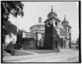 The dome and vaulting of the current structure is of tiles by Rafael Guastavino, it is the first dome that he constructed in the U.S.[13] The dome and vaulting originally featured exposed red Guastavino tile on its exterior, but this was later covered with copper. The original towers were damaged in storms, and were replaced in 1958.[14]