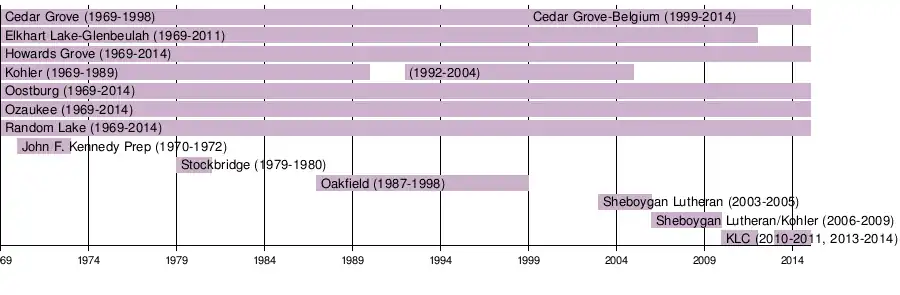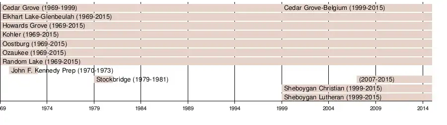 The Central Lakeshore Conference was formed in 1969 by seven small high schools in Sheboygan and Ozaukee Counties in east central Wisconsin.[1] Four members were previously in the Eastern Wisconsin Conference (Cedar Grove, Elkhart Lake-Glenbeulah, Kohler and Oostburg), two entered from the disbanded Kettle Moraine Conference (Howards Grove and Ozaukee) and Random Lake joined after leaving the Scenic Moraine Conference. The recently opened John F. Kennedy Prep in St. Nazianz joined a year later,[2] but their stay in the conference was short-lived. The Catholic high school was removed from the Central Lakeshore Conference in 1973 because of alleged violations against rules on student transfers.[3] The Central Lakeshore Conference's membership roster would remain relatively stable for a quarter century with the only change being a short stint in the conference for Stockbridge from 1979[4] to 1981.[5] Oakfield joined as a football-only member from 1987[6][7] through the 1998 season[8] after competing in the Flyway Conference, which remained their primary affiliation for all other sports.[9] In 1999, two private high schools in Sheboygan (Sheboygan Christian and Sheboygan Lutheran) would join as part of the WIAA/WISAA merger.[10] Stockbridge rejoined the Central Lakeshore in 2007 for the final eight years of the conference's run.[11] In 2015, all members of the Central Lakeshore Conference with the exception of Stockbridge joined with five members of the Olympian Conference (Hilbert, Manitowoc Lutheran, Mishicot, Reedsville and St. Mary Catholic in Neenah) to form the fourteen-member Big East Conference.[12]