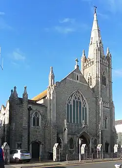 Central Methodist Church is an elaborate Decorated Gothic Revival building of grey stone rubble laid in courses with some ashlar. The roof is laid with pantiles, which are not original.[25][44] Nikolaus Pevsner wrote that its appearance was "entirely churchy"—resembling an Anglican place of worship much more than typical Nonconformist chapels of the era (of which Eastbourne has several examples).[56]