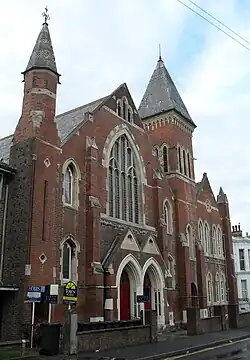 For several years until 2013, a Baptist congregation shared the church premises.[47] Ceylon Place Baptist Church, a brick and Bath stone Early English Gothic Revival building, was built on the road of that name in 1885 to replace a tin tabernacle erected in 1871.[25][48] It closed in the early 21st century and was converted for residential use.[49] The congregation moved to Central Methodist Church temporarily while they sought a new place of worship. The community, now known as New Hope Baptist Church, relocated to a building in Longstone Road[50] before buying a former social club on Beach Road and converting it into a church.[51]