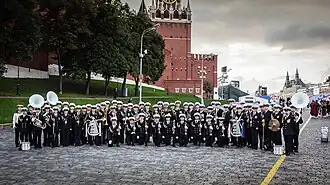 On December 23, 1941, the band of the Ulyanovsky Fleet was formed with 53 Musicians, mostly consisting of sailors, front-line soldiers who came from hospitals. The first appointed military conductor was 1st rank Captain Alexander Karpey-Lazarev. In order to improve the training of the musicians of the bands of the navy (especially the fleet forces and the naval infantry), the band was transformed in October 1944 as a training band unit of the Soviet Navy. In February 1993, in honor of the 150th birthday of Russian composer Nikolai Rimsky-Korsakov, the orchestra was given its current honorary name of the Central Concert Band of the Navy Nikolai Rimsky-Korsakov. In different years, the orchestra has performed during concerts in places such as Afghanistan, Chechnya and Syria. Since 1945, the orchestra has been a constant participant in the Victory Parades on Red Square, and since 2017, it has been the main musical participant in Naval Parades in St. Petersburg.[1][2]
