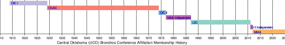 The Central Oklahoma Bronchos joined the Mid-America Intercollegiate Athletics Association (MIAA) in 2012, along with in-state rival Northeastern State University.[4][5][6] Previously, Central Oklahoma competed in the first Oklahoma Intercollegiate Conference (OIC) from 1919 to 1929; the Oklahoma Collegiate Athletic Conference from 1929 to 1974; was a charter member of the second Oklahoma Intercollegiate Conference from 1974 to 1977; as an NAIA Independent from 1977 to 1987, and the Lone Star Conference (LSC) from 1988 to 2011. The Bronchos participated in the LSC's North Division from 1997 to 2011.[7] In the 2011–12 athletic season, the Bronchos participated as an NCAA Division II independent before joining the MIAA the following year as part of its transition after leaving the LSC.