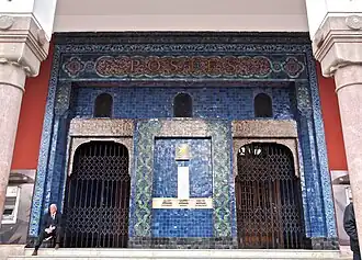 Post boxes, labeled in Arabic and French, in the mosaic façade of the public entrance