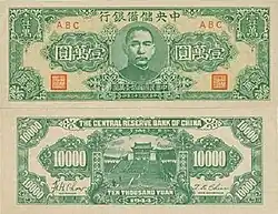 Banknotes issued by the Central Reserve Bank bear a portrait of Sun Yat-sen, as did the earlier notes issued by the Central Bank of the Republic of China under Chiang Kai-shek.[6]