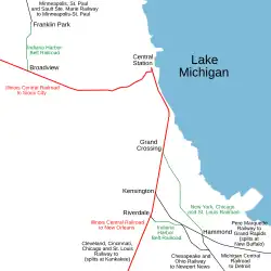 Also sharing the station was the Michigan Central Railroad, part of the New York Central Railroad system, which had shared the IC's terminal from its opening in 1852. The Michigan Central connected with the Illinois Central at Kensington. The Cleveland, Cincinnati, Chicago and St. Louis Railway (Big Four), also a New York Central line, joined the IC at Kankakee and also used Central Station. Using the station from the beginning was the Chicago and West Michigan Railway, consolidated into the Pere Marquette Railroad in 1900. At the time it used the Michigan Central west from New Buffalo, Michigan.