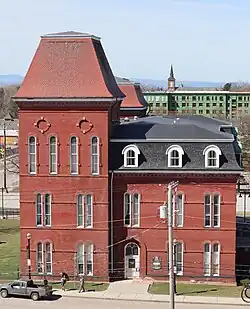 The Central Vermont Railroad Headquarters complex is located just west of St. Albans' central business district, and is roughly bisected by Lake Street. It is bounded north of Lake Street by Pine and Federal Streets, and south of Lake by Houghton, Market, and Allen Streets. It includes buildings originally used as maintenance sheds, a freight depot, roundhouse, and the main office building that served as the Central Vermont's headquarters. The latter structure, built in the 1870s and located on the north side of Lake Street, is the dominant feature of the complex, distinguished by its Second Empire architecture and pair of 3-1/2 story mansard-roofed towers. North of that building stands a c. 1900 switch house which now serves as the depot for the Amtrak station, and north of that is a large roundhouse. On the south side of Lake Street is a large complex of maintenance facilities, which have mostly been repurposed to other commercial and industrial uses.[2]